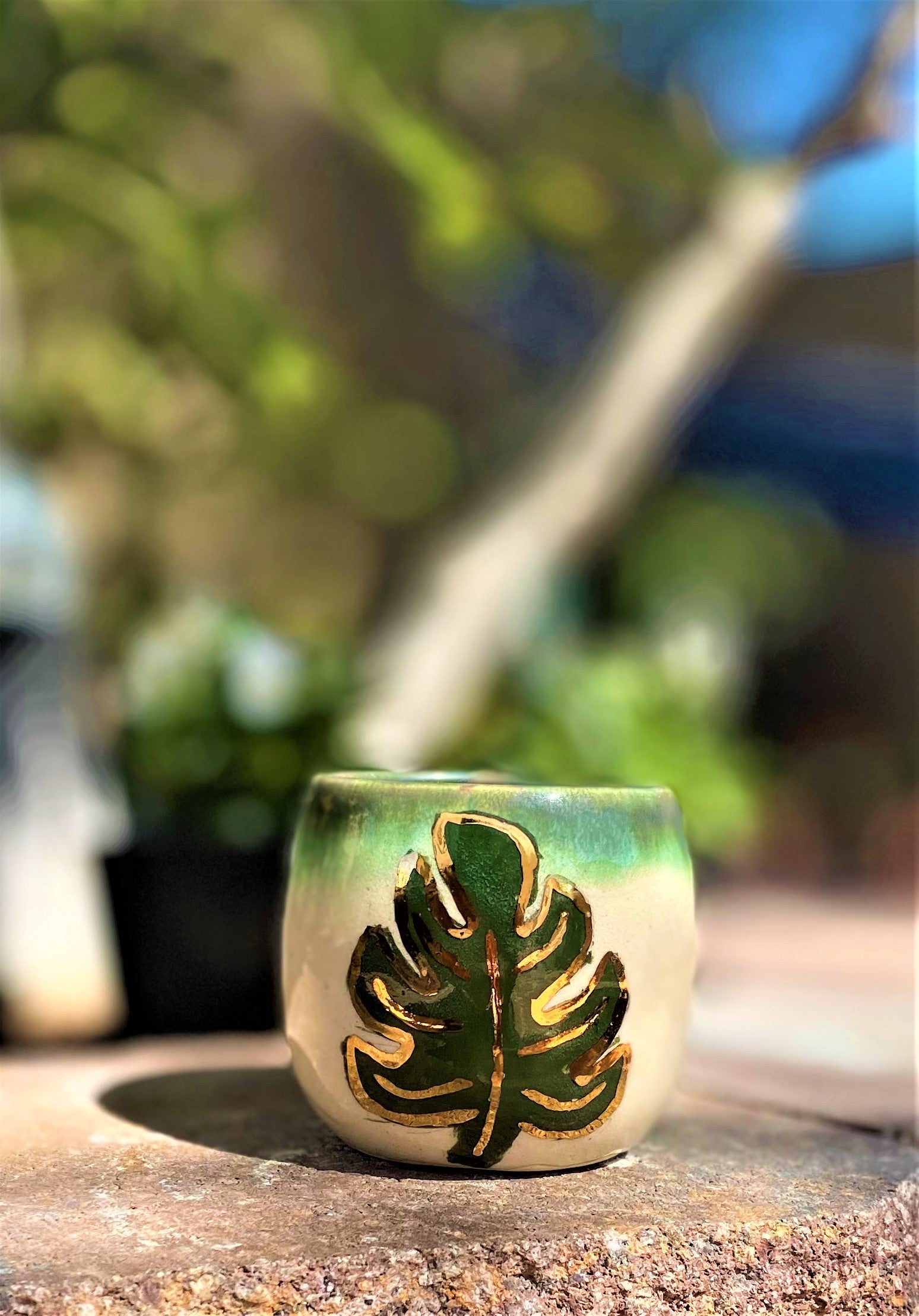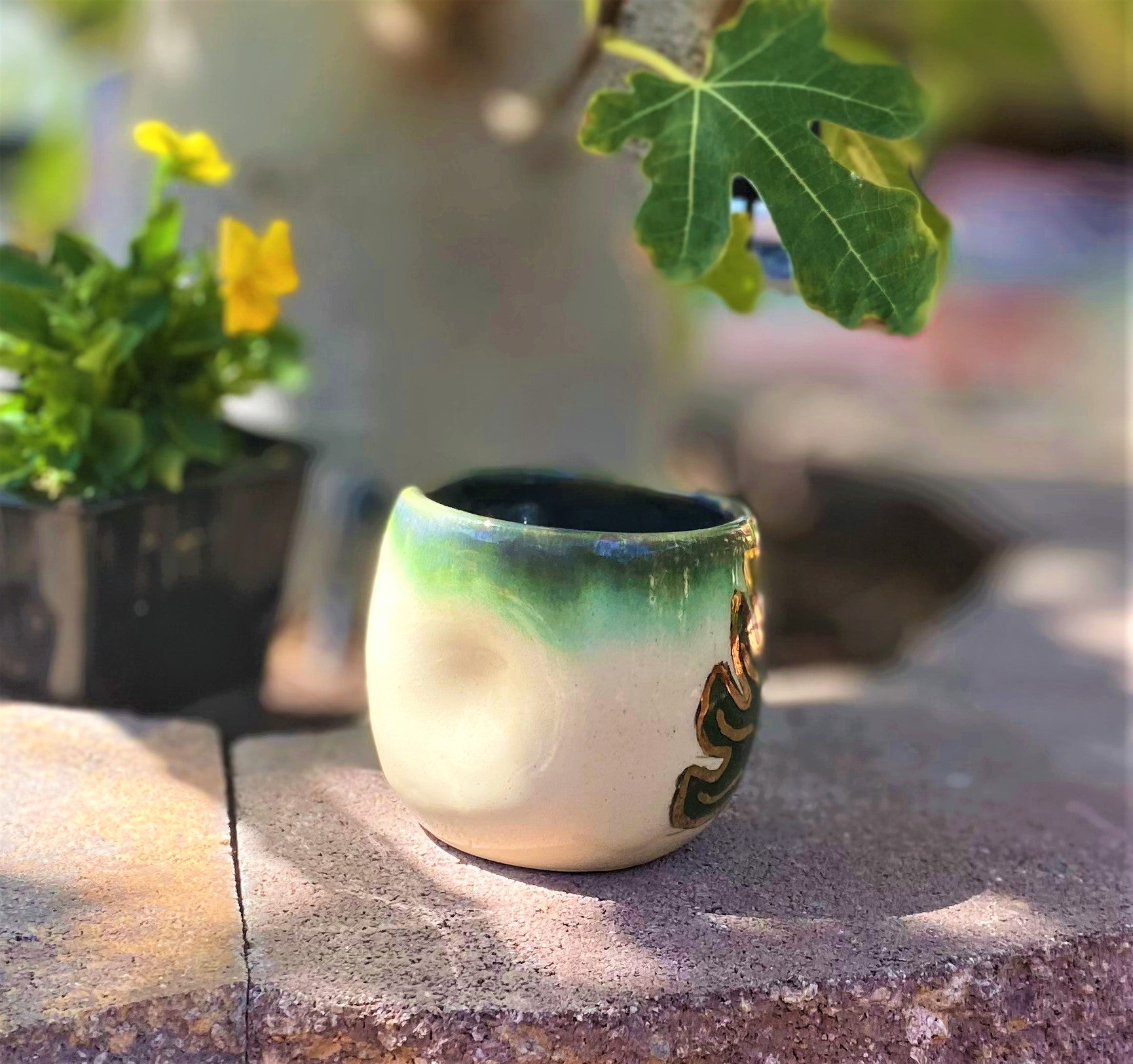 Another piece inspired by indoor gardens. This was my favorite piece coming out of the glaze fire. What is a thumb cup? It's a tumbler with an indentation for your thumb to rest to better grip the cup. Pottery wheel thrown and embellished with real, 22k gold. This one is super comfy to hold!
